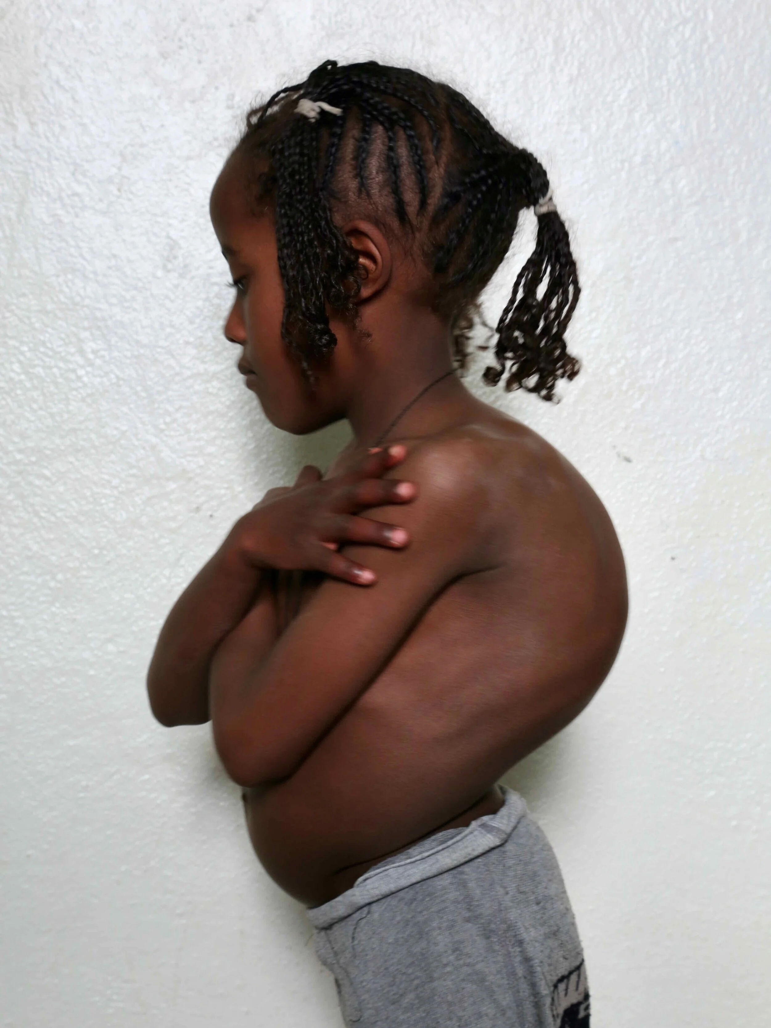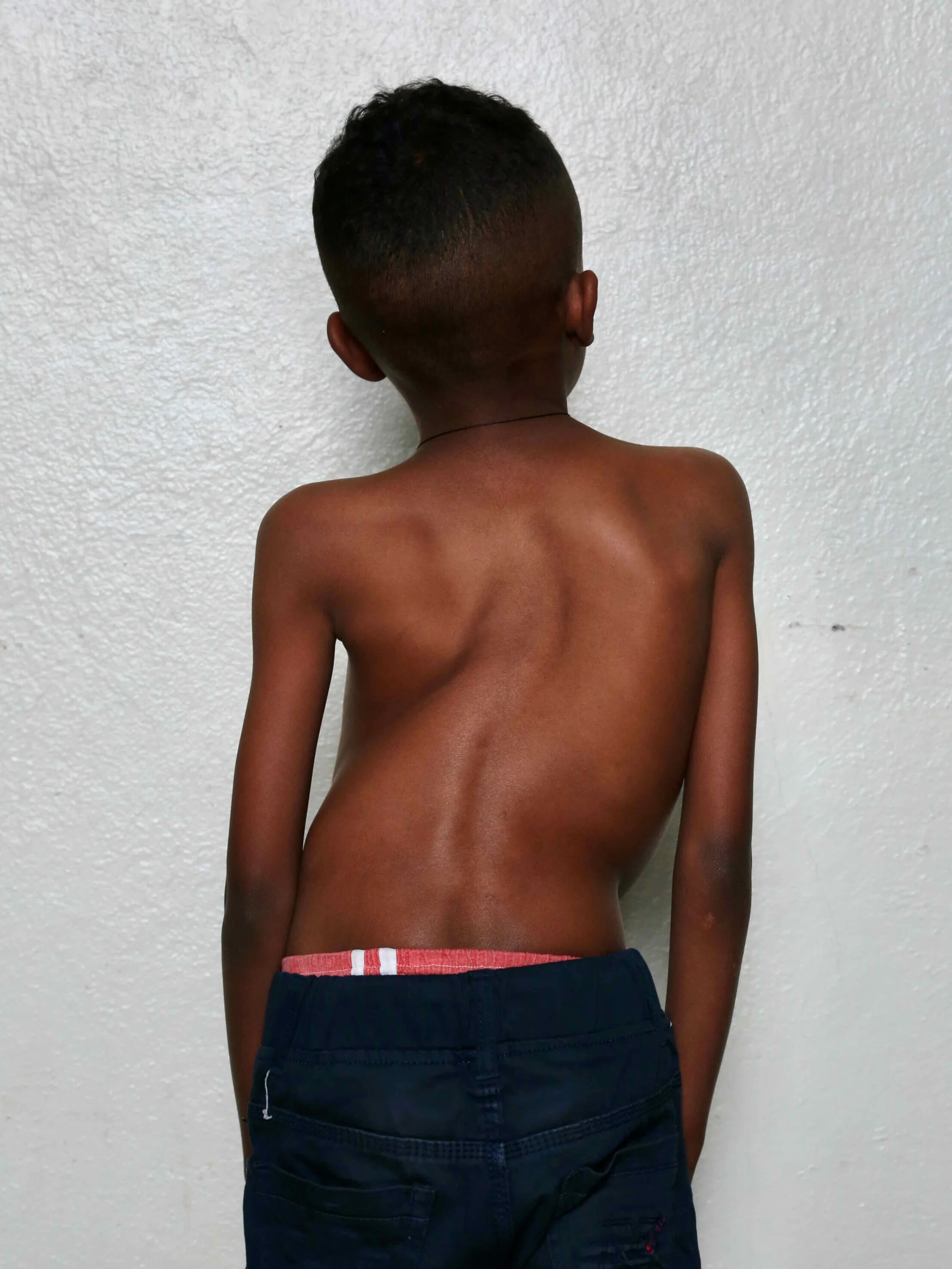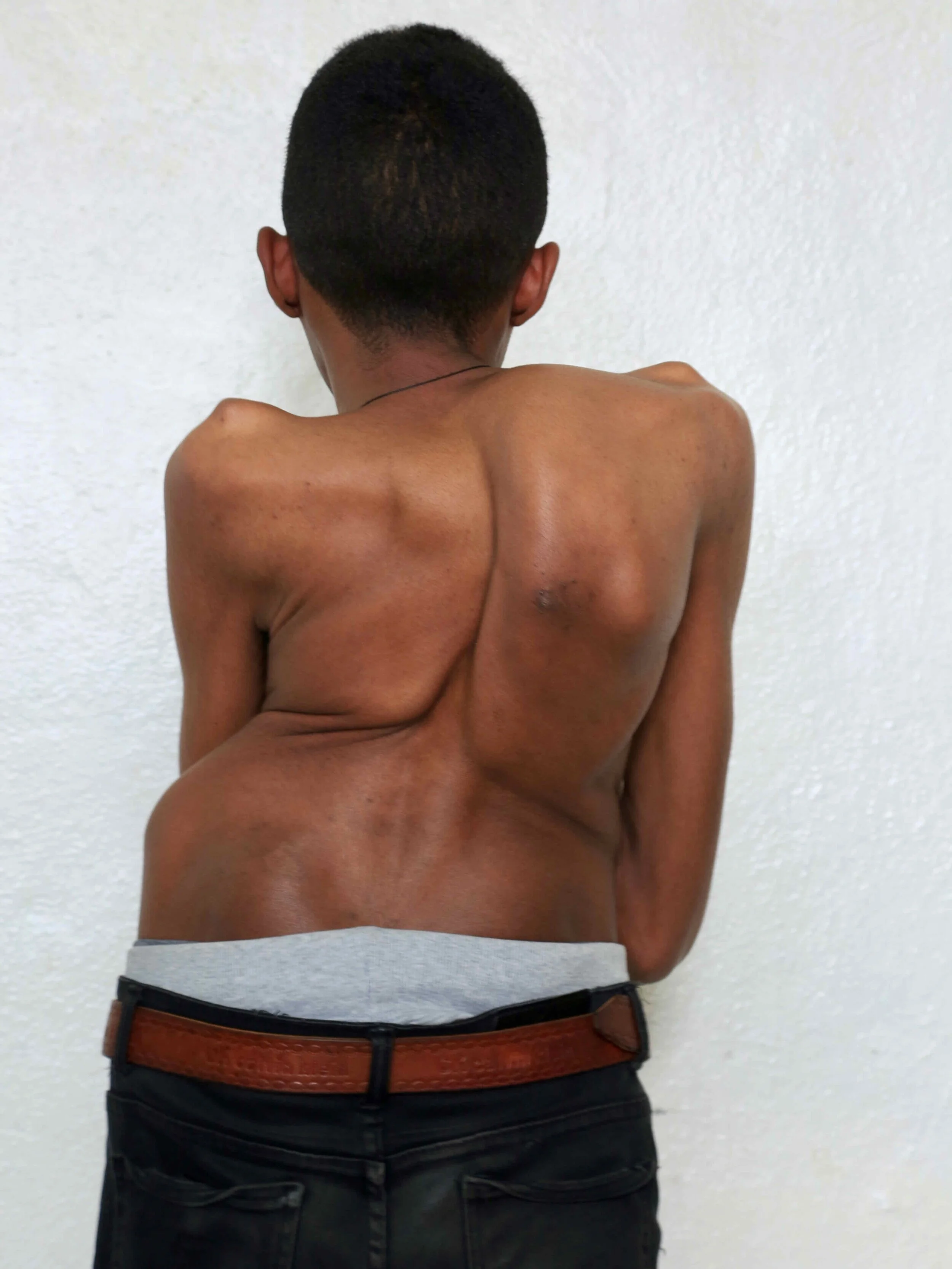 On Jan 30, 2010, Dr. Rick was walking in the street near Addis Ababa University and saw Befekadu walking on the roadside. He saw Befekadu’s spinal deformity and told him “I think I can change your life,” and asked him to join us in clinic. We diagnosed a spinal angle over 180 degrees, and a 75% reduction in lung function. At the time, we were not yet using long-term traction. He did not return for follow-up.